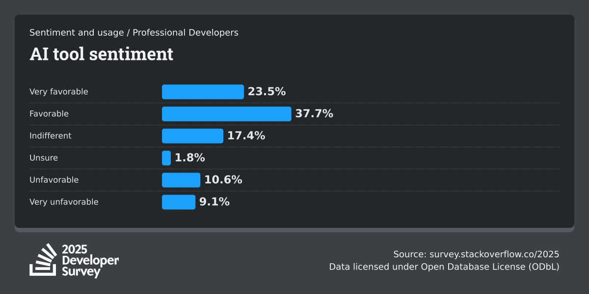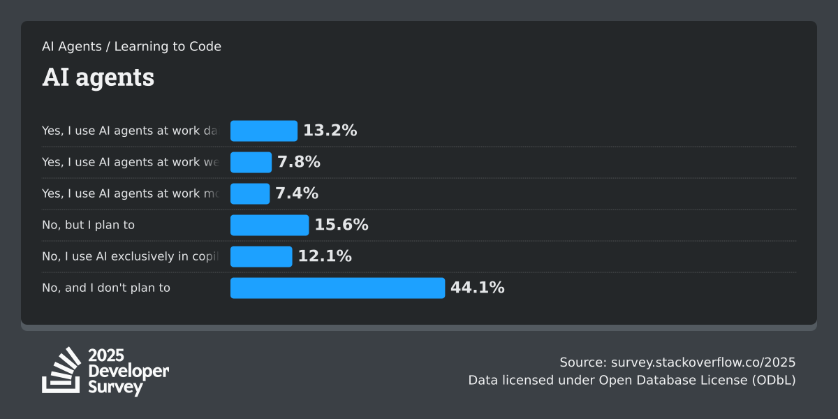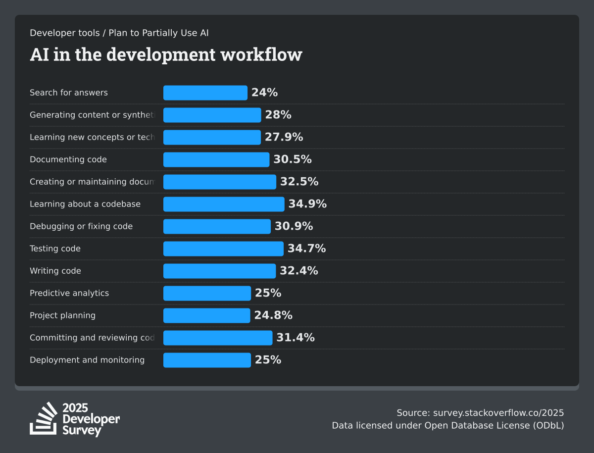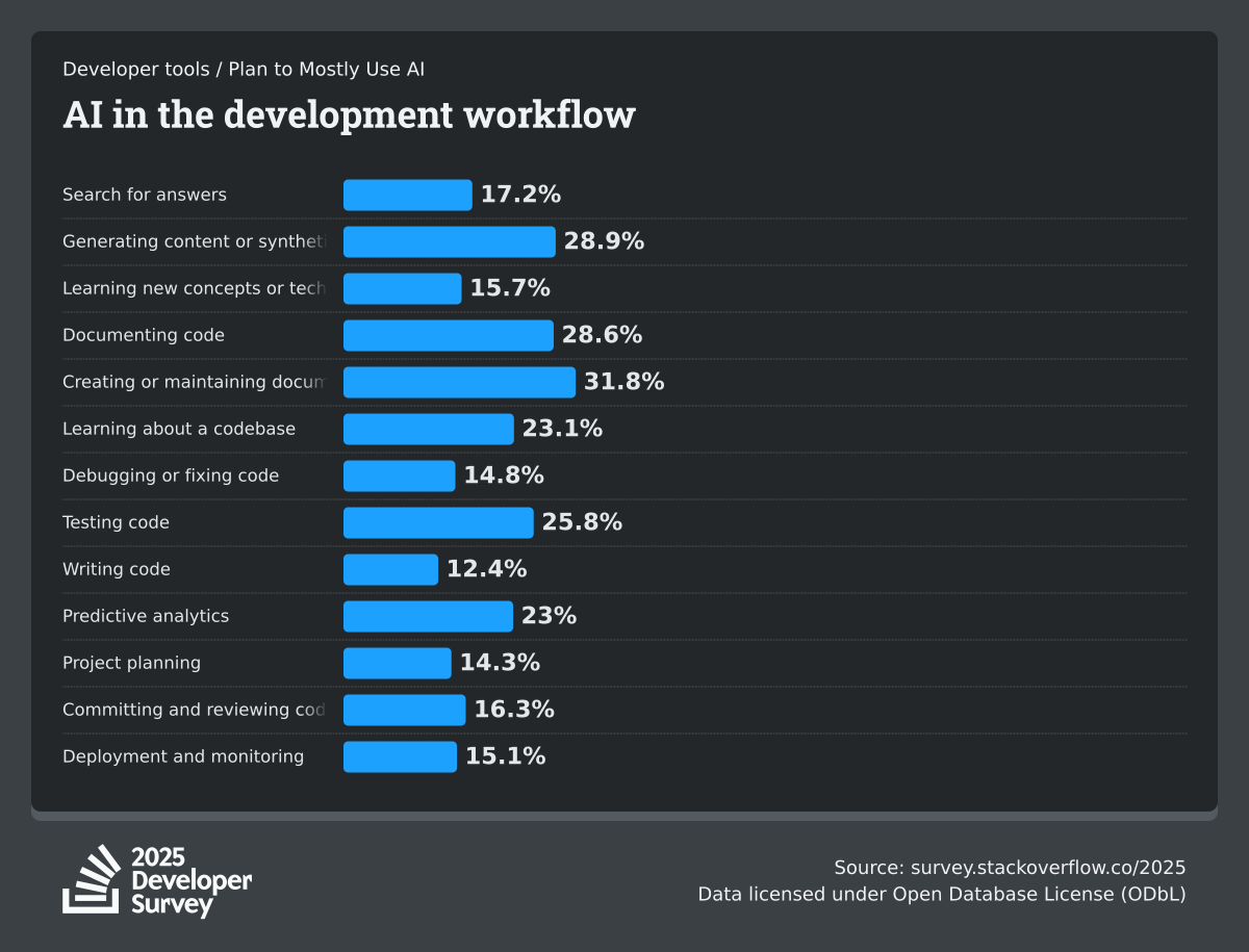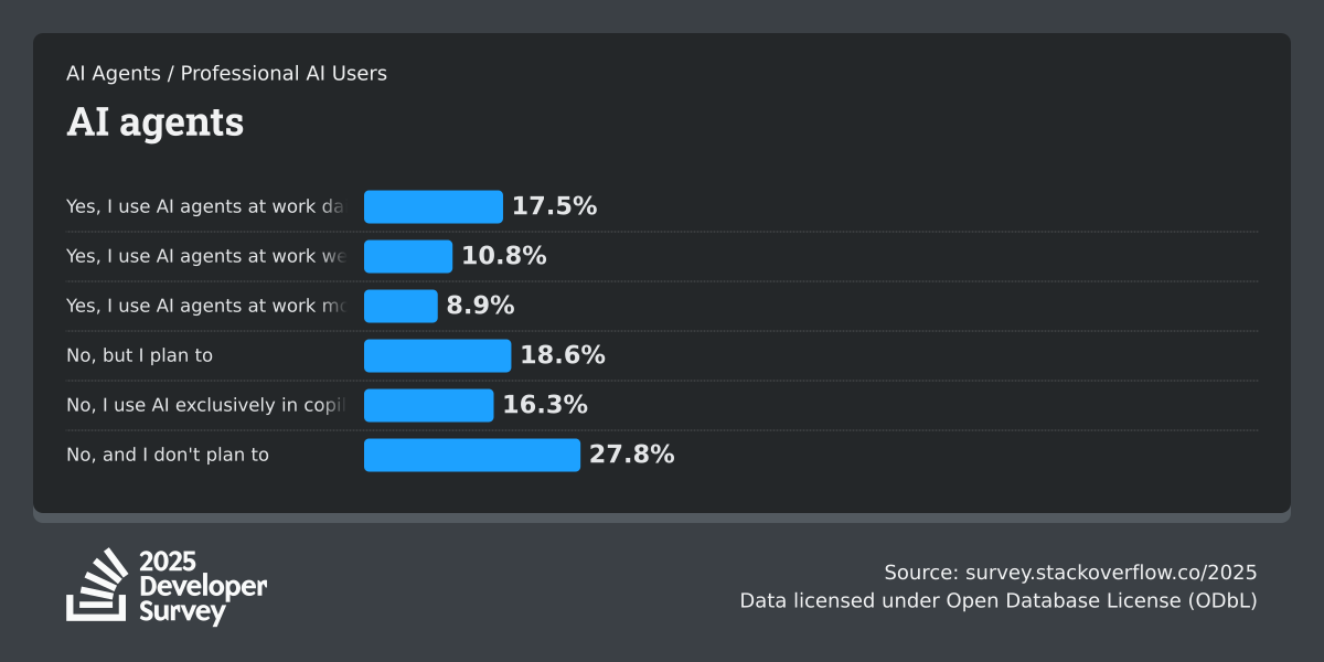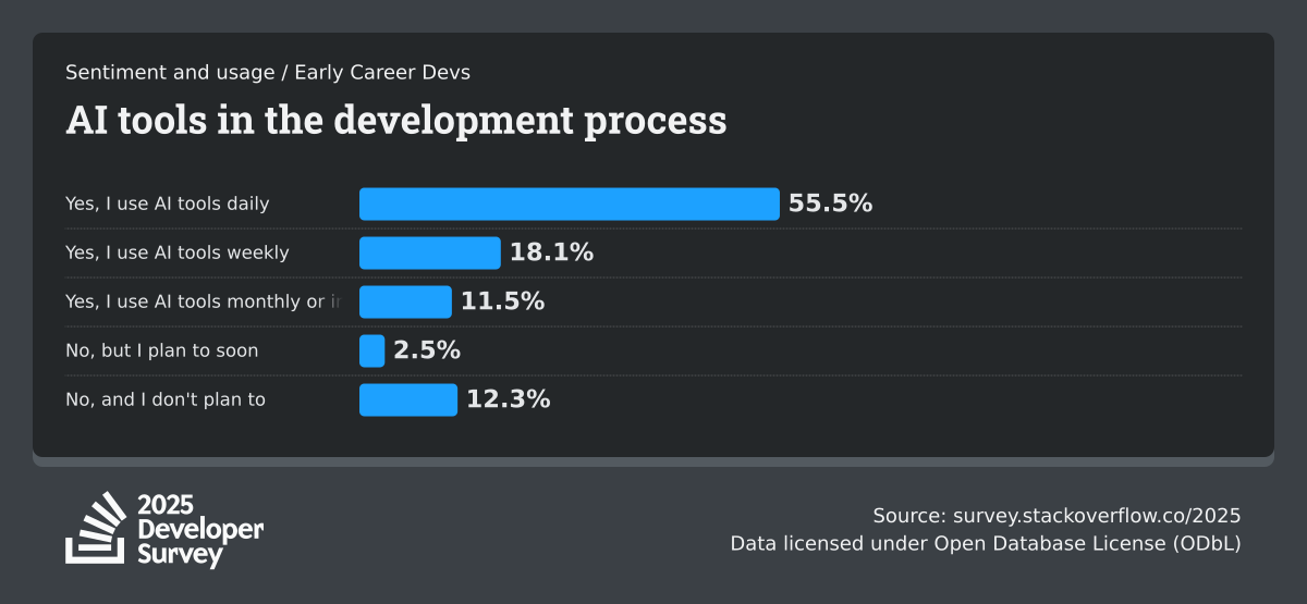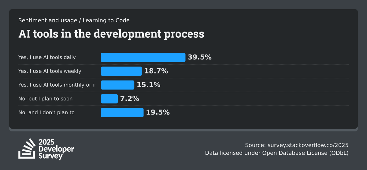 84% of respondents are using or planning to use AI tools in their development process, an increase over last year (76%). This year we can see 51% of professional developers use AI tools daily.