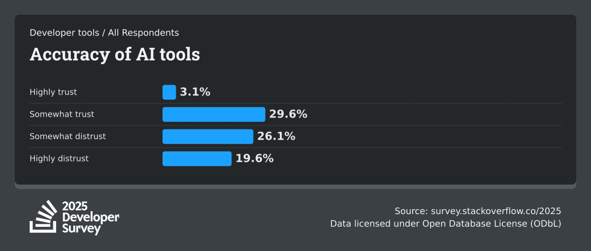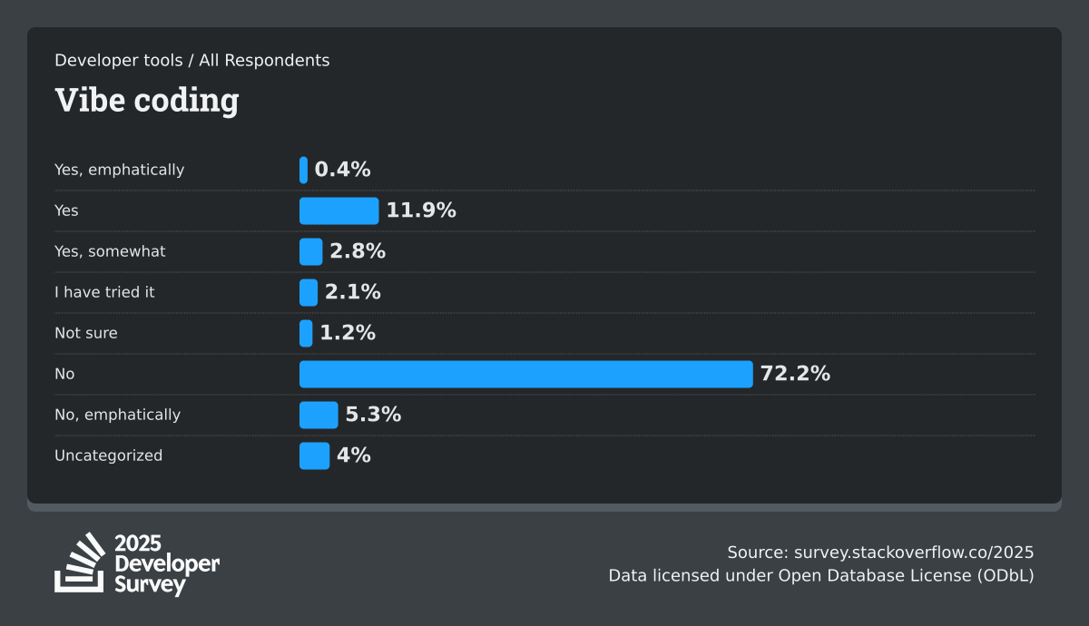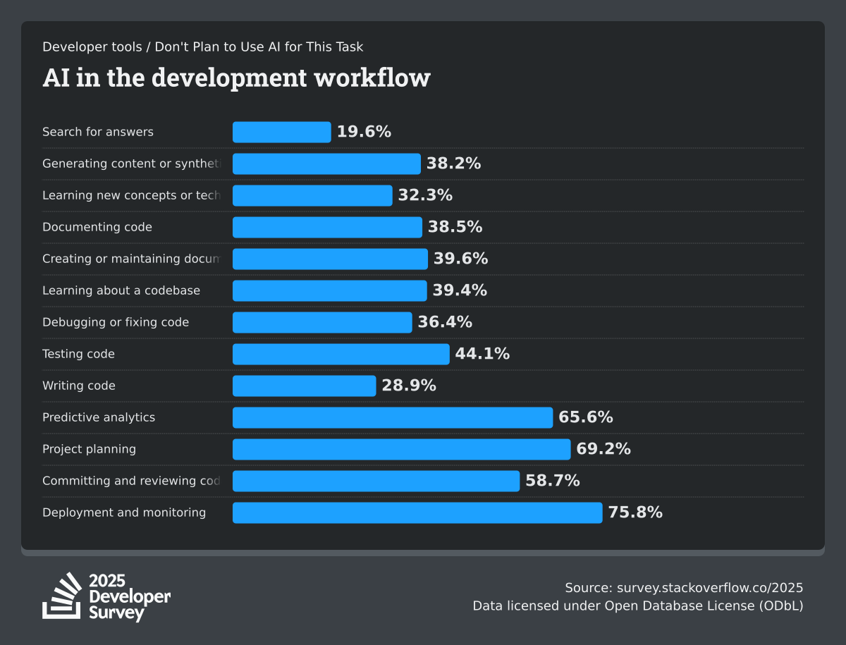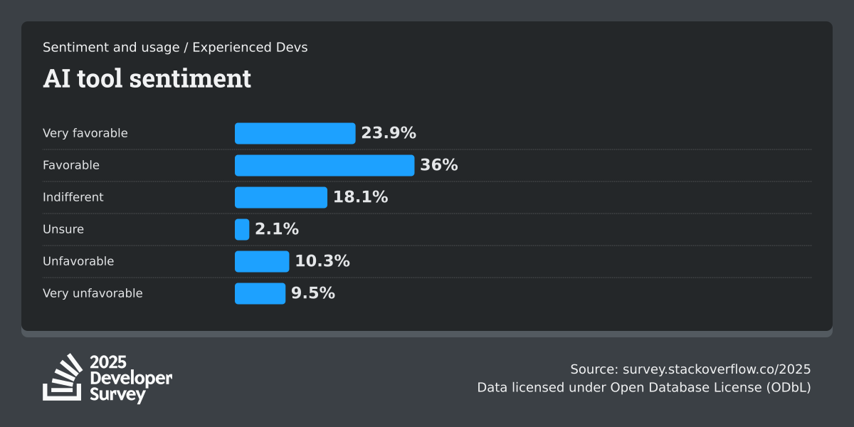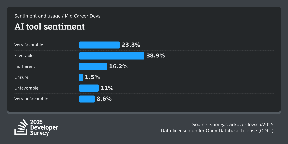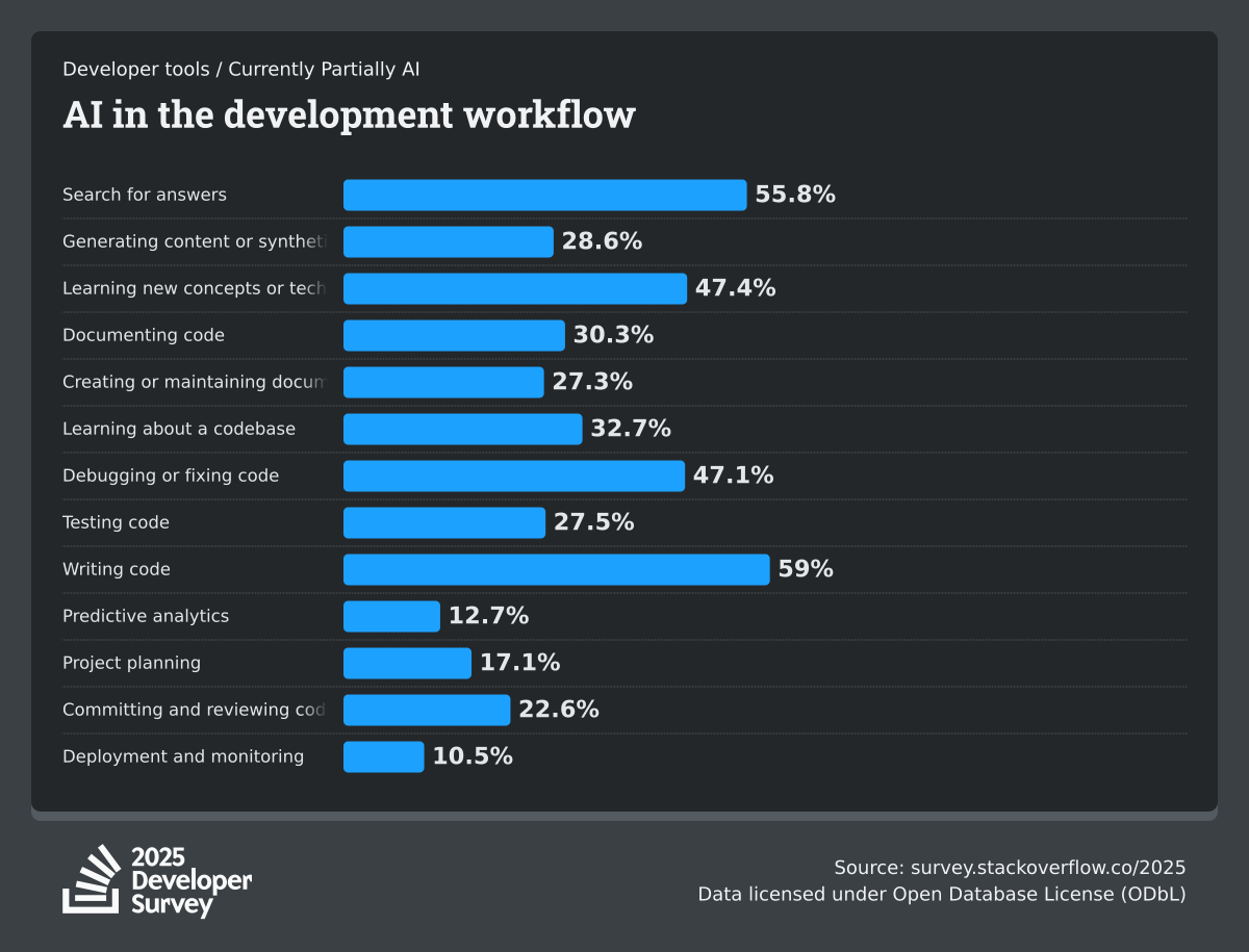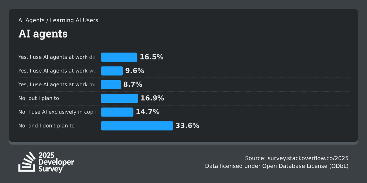 84% of respondents are using or planning to use AI tools in their development process, an increase over last year (76%). This year we can see 51% of professional developers use AI tools daily.