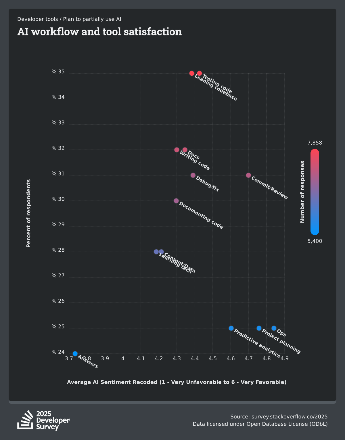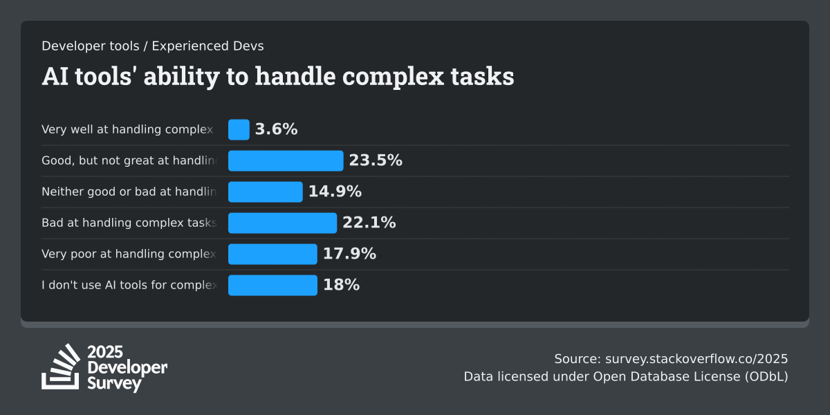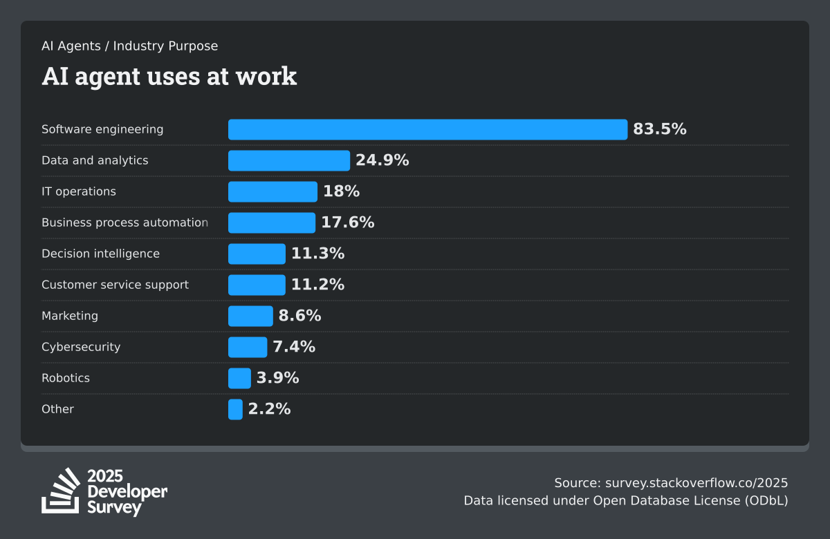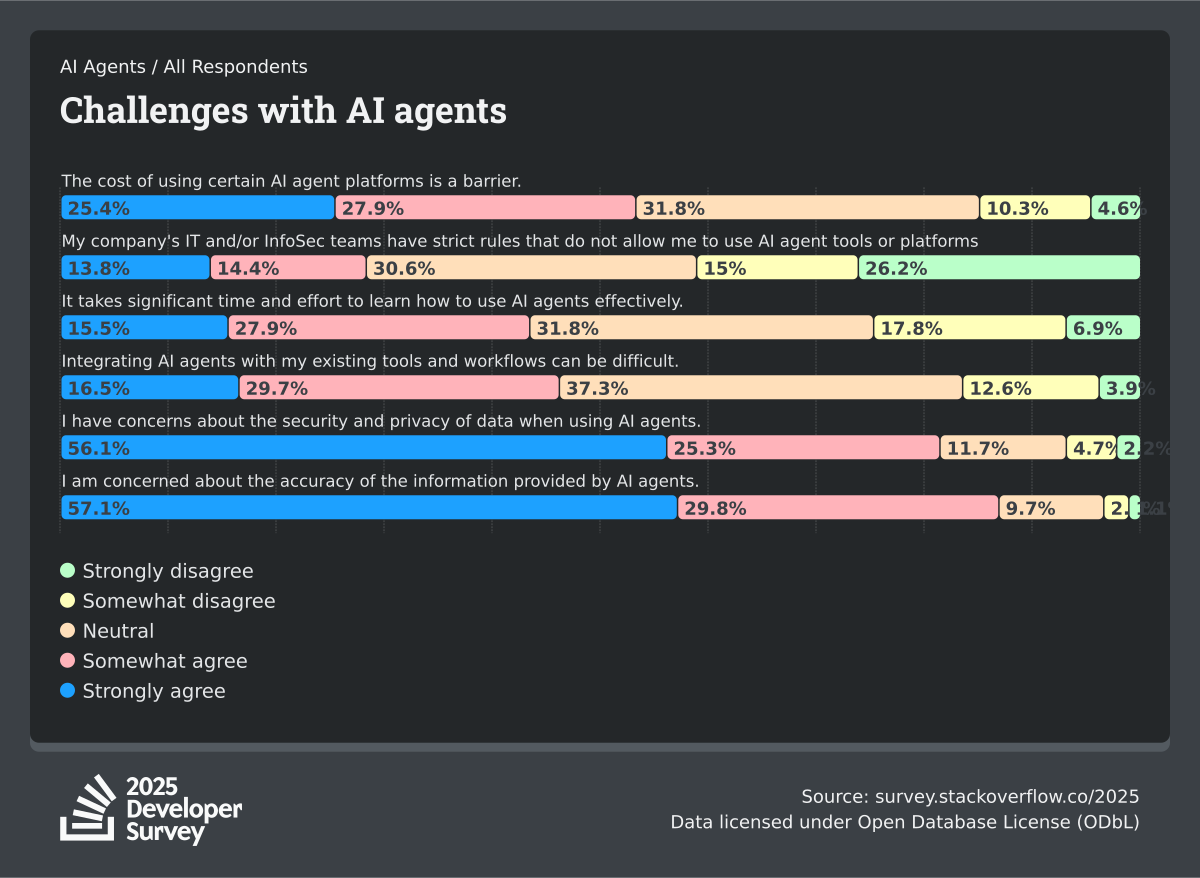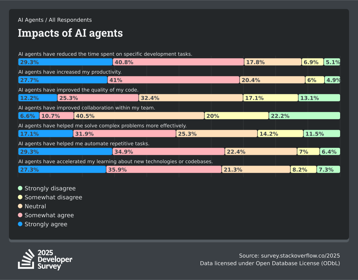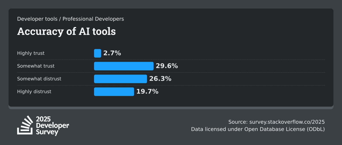 84% of respondents are using or planning to use AI tools in their development process, an increase over last year (76%). This year we can see 51% of professional developers use AI tools daily.