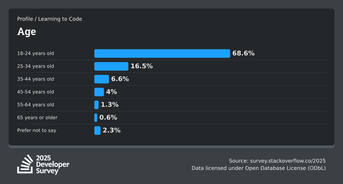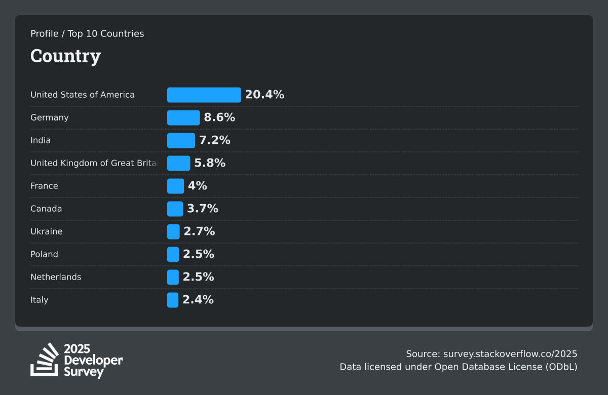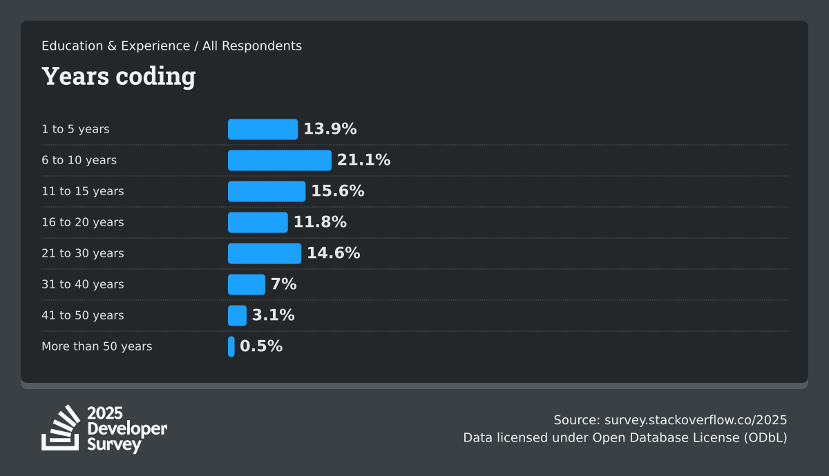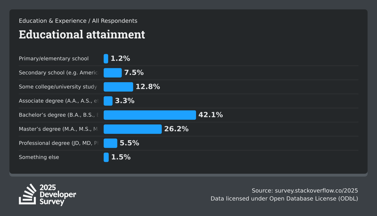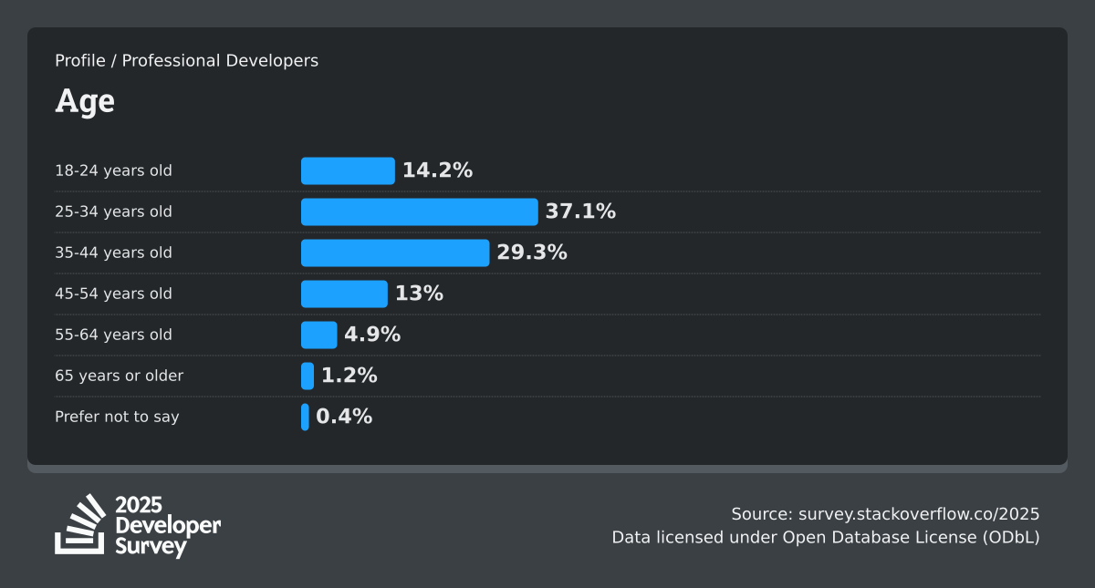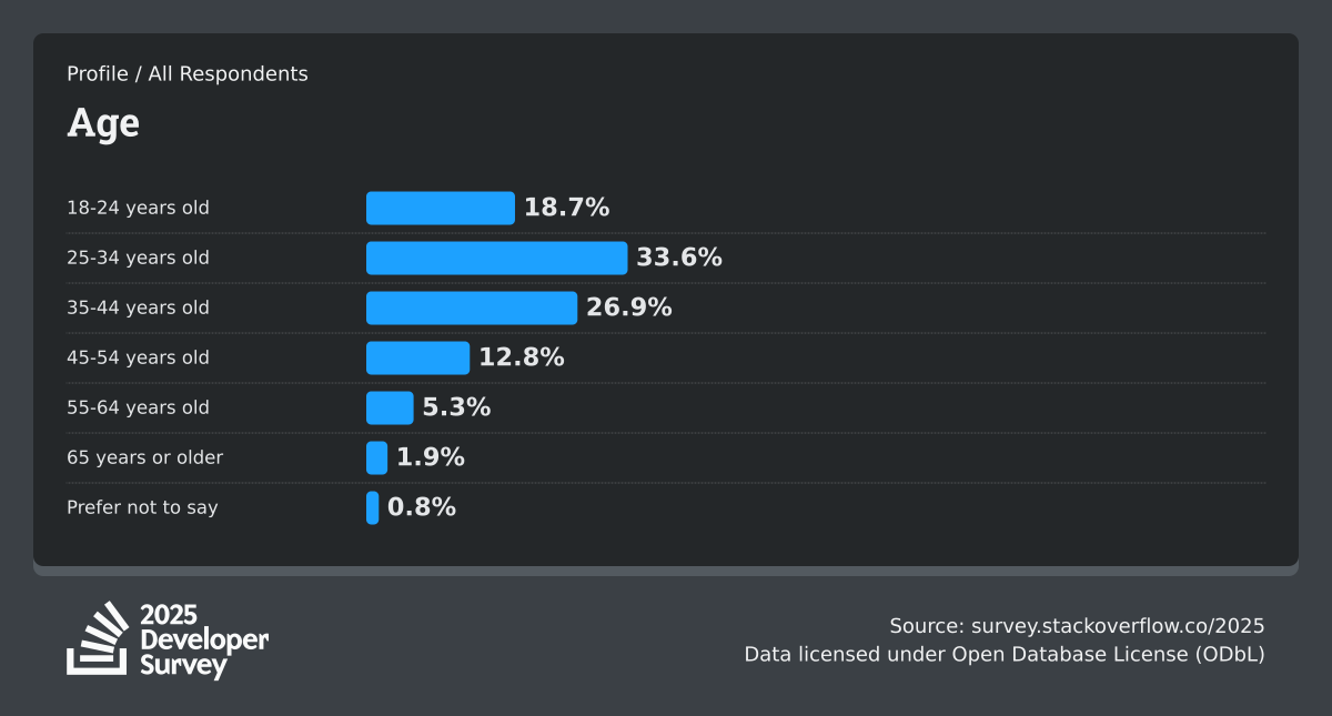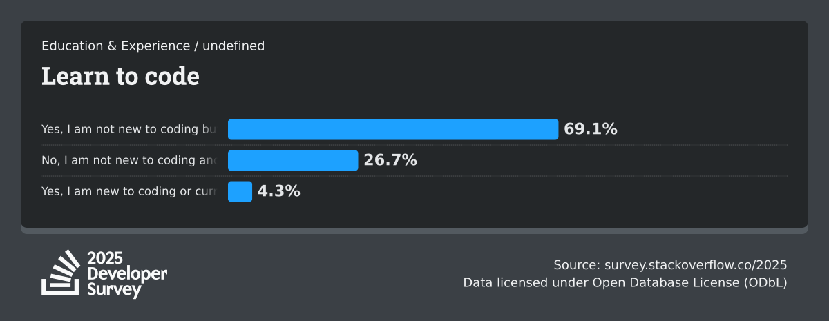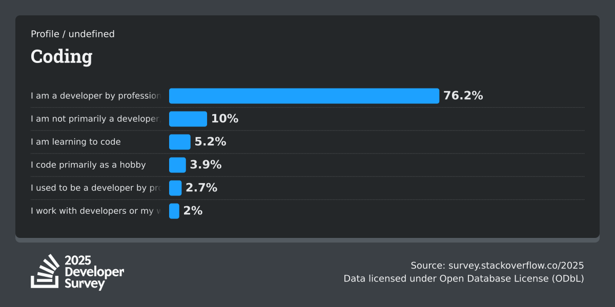 The Developer Survey is meant to explore insights for those that code. A majority of respondents (76%) are professional developers with an additional 15% that are aspirational or adjacent.