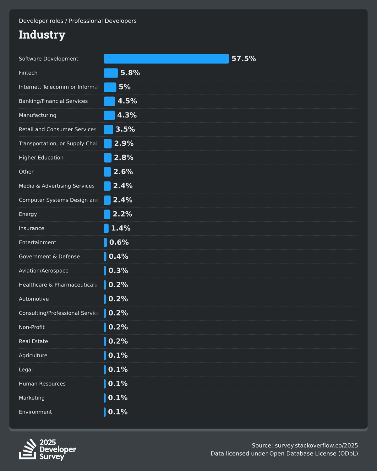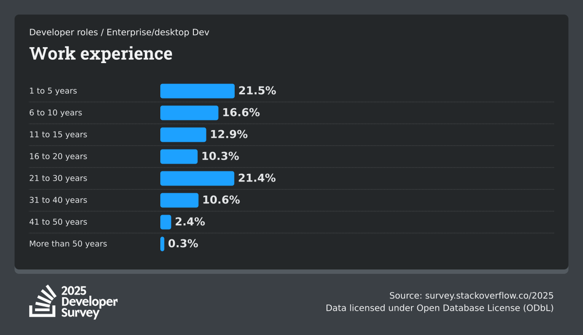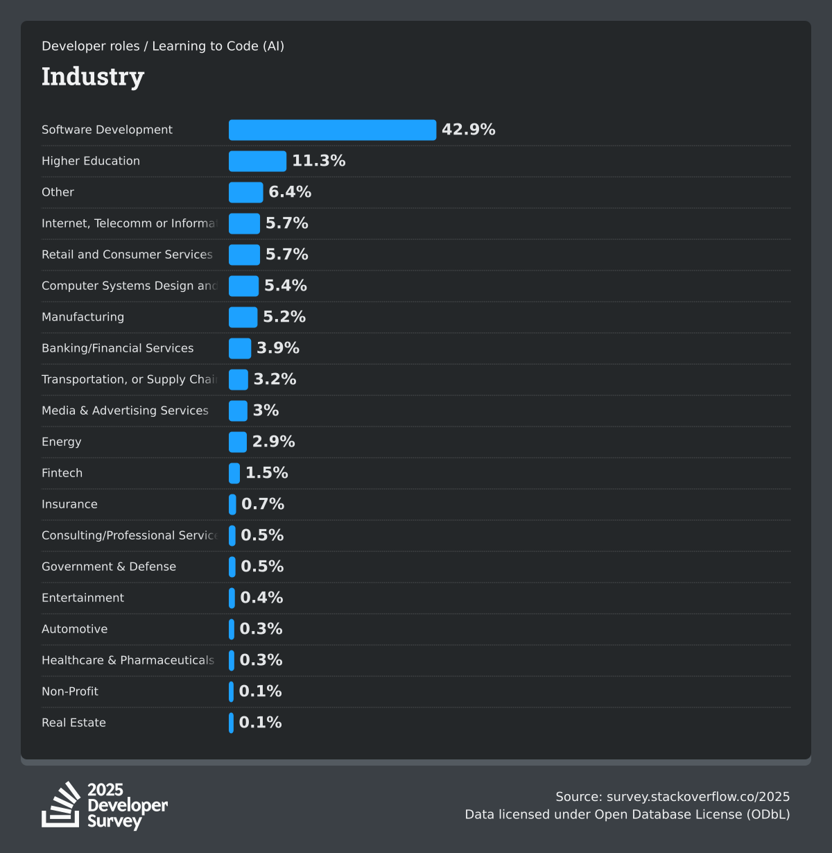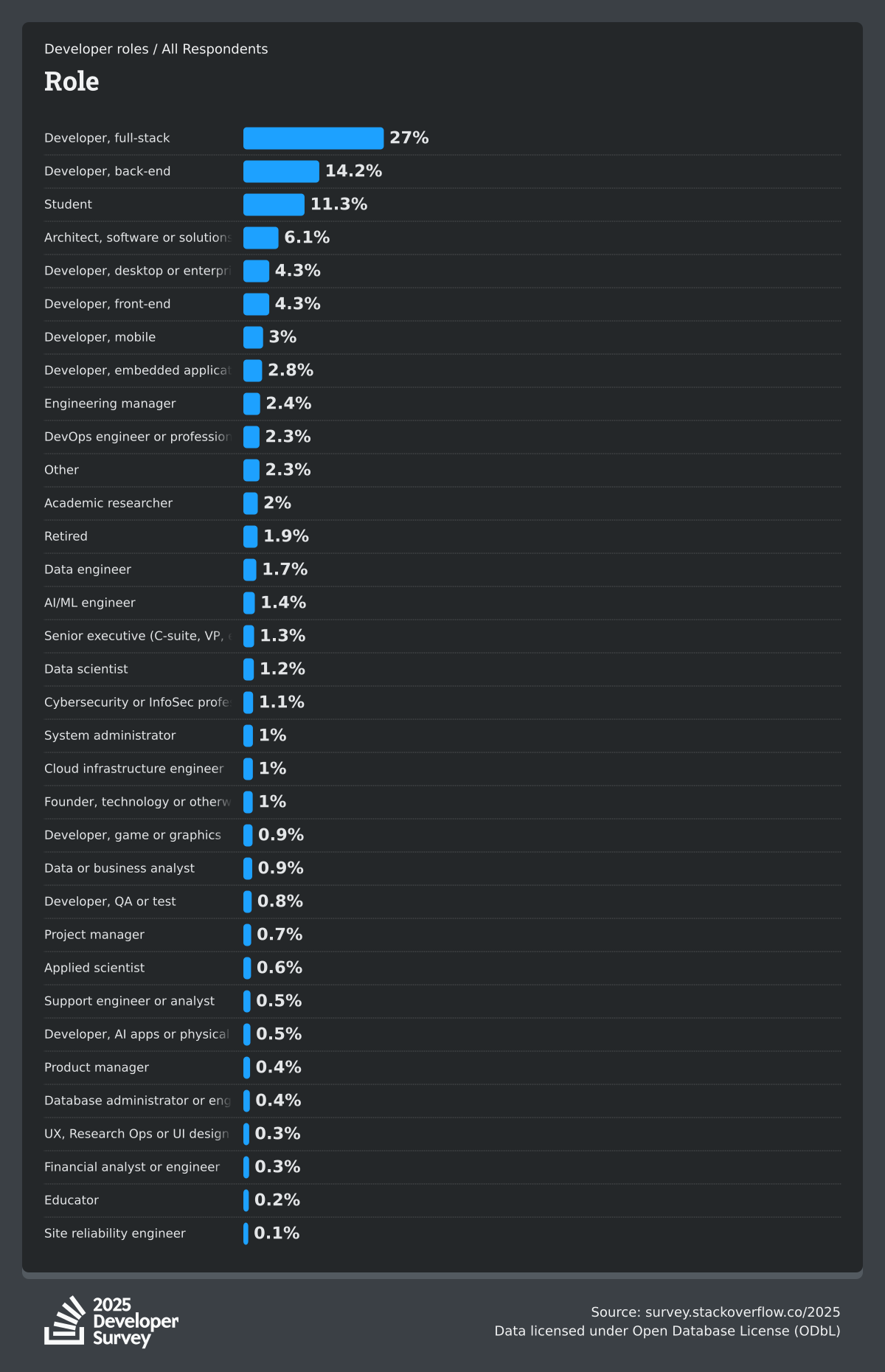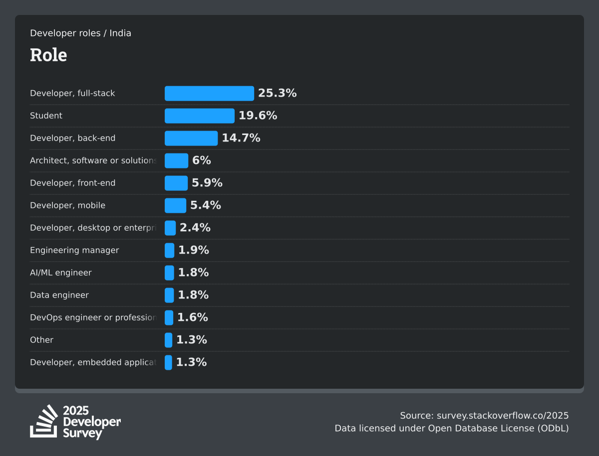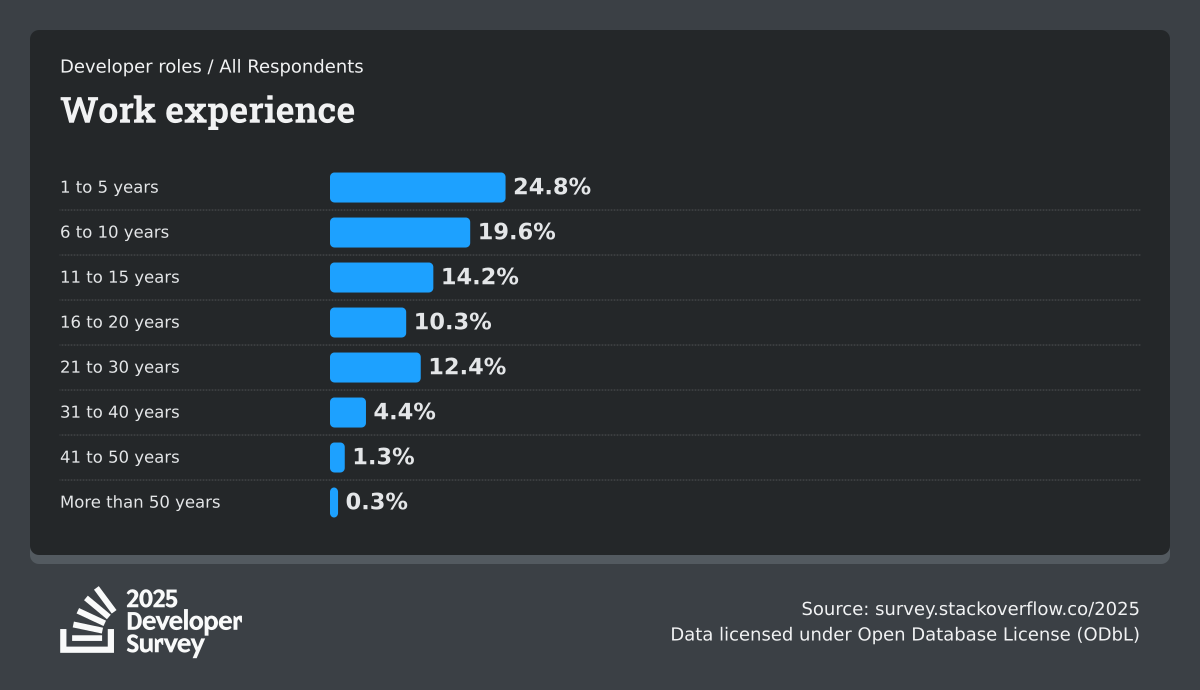The Developer Survey is meant to explore insights for those that code. A majority of respondents (76%) are professional developers with an additional 15% that are aspirational or adjacent.