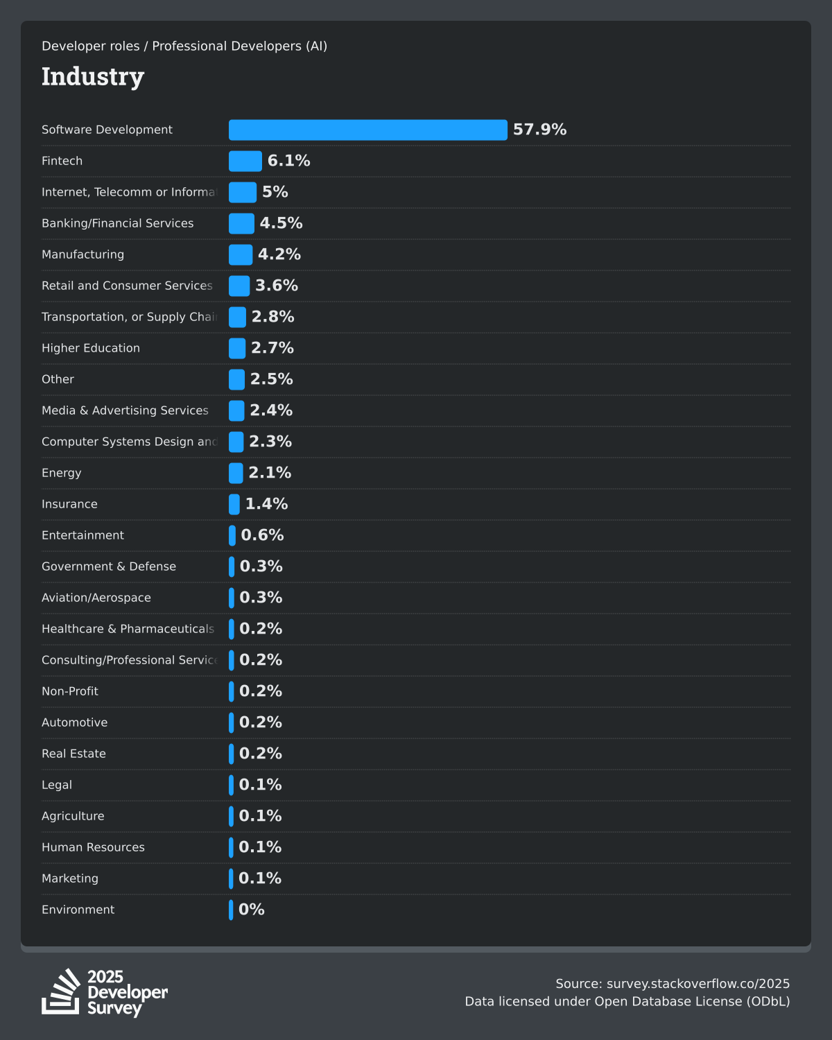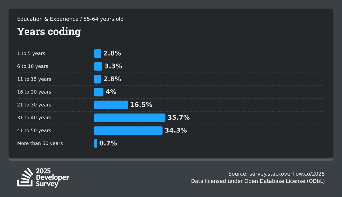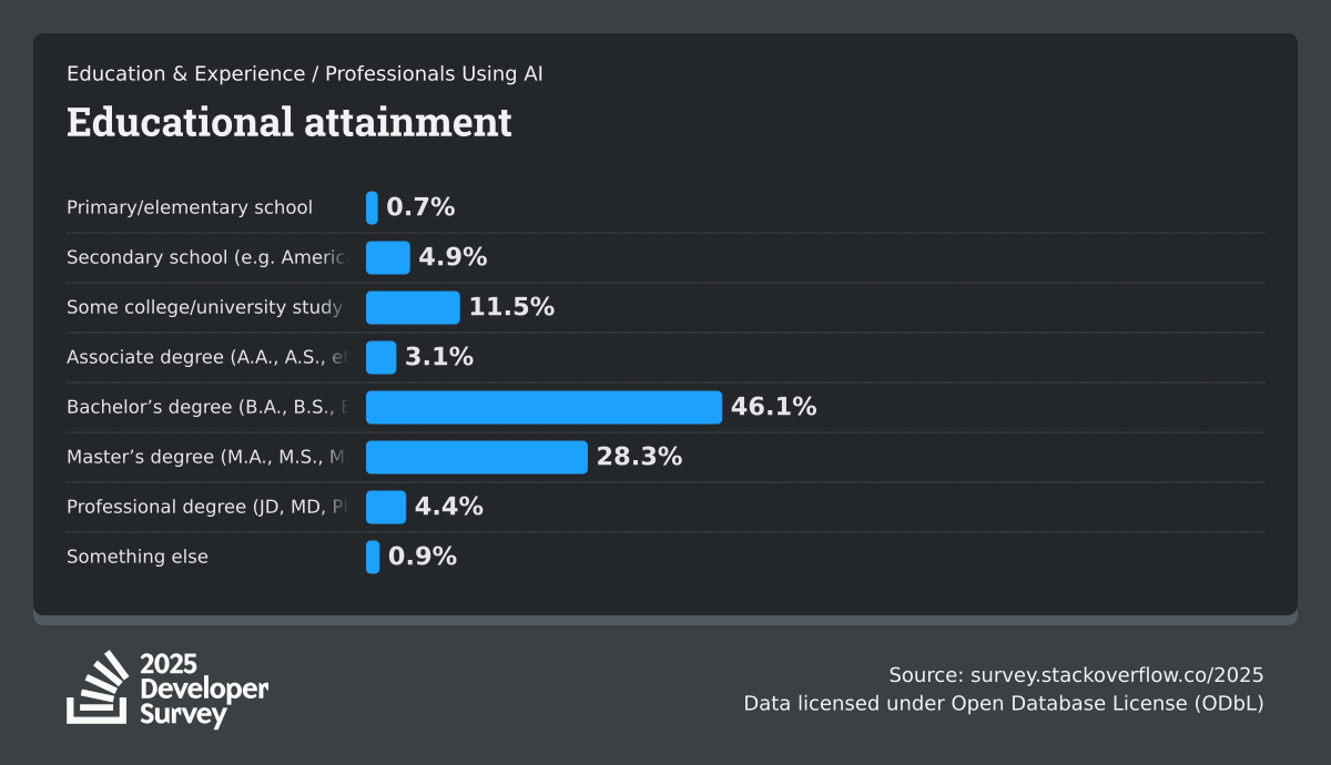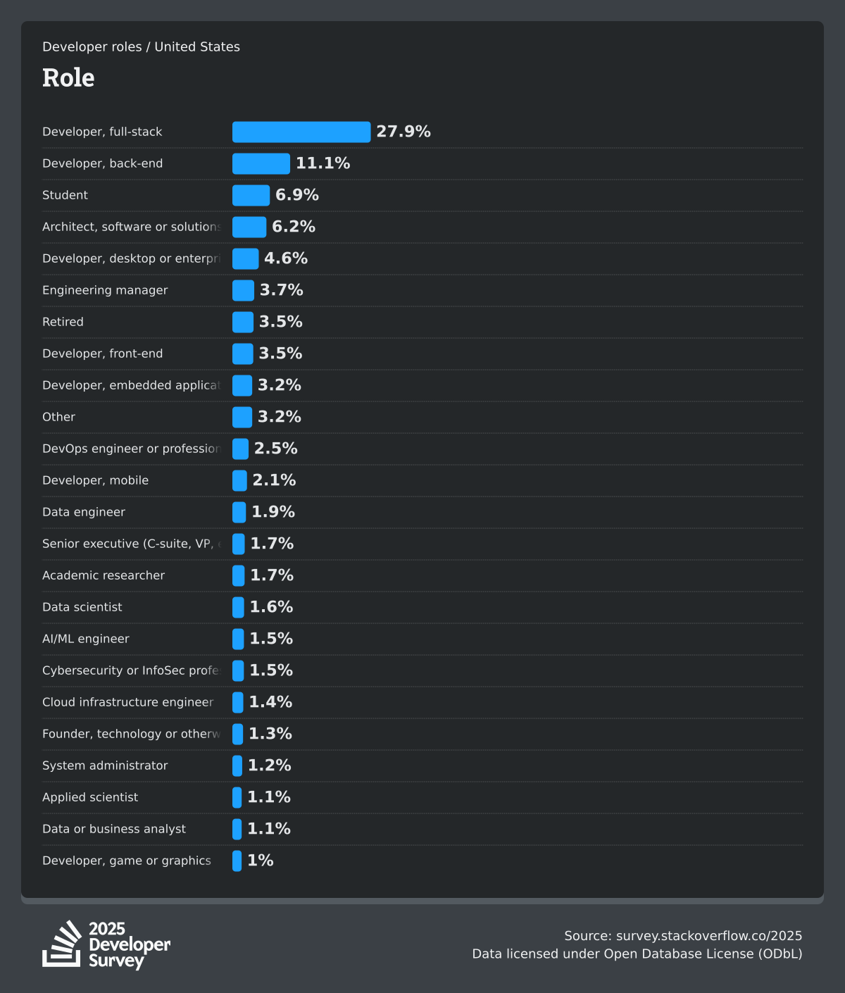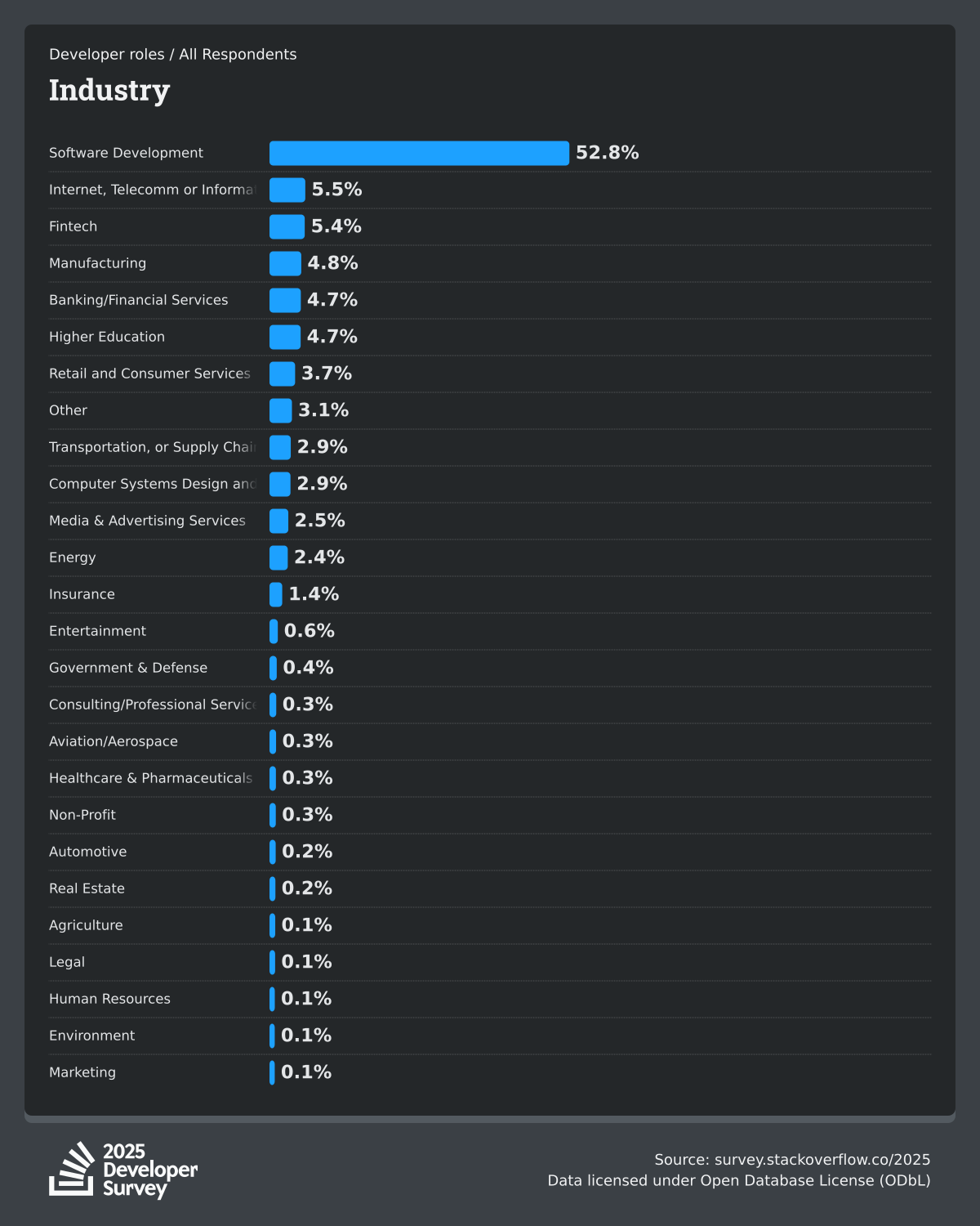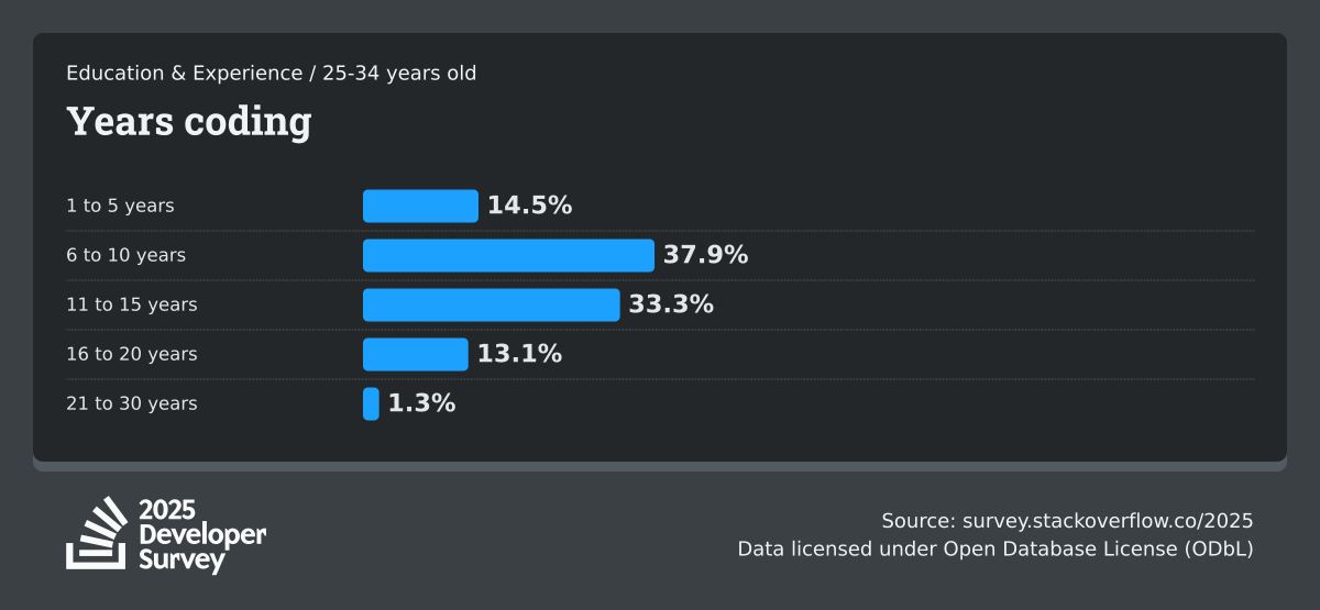 The Developer Survey is meant to explore insights for those that code. A majority of respondents (76%) are professional developers with an additional 15% that are aspirational or adjacent.