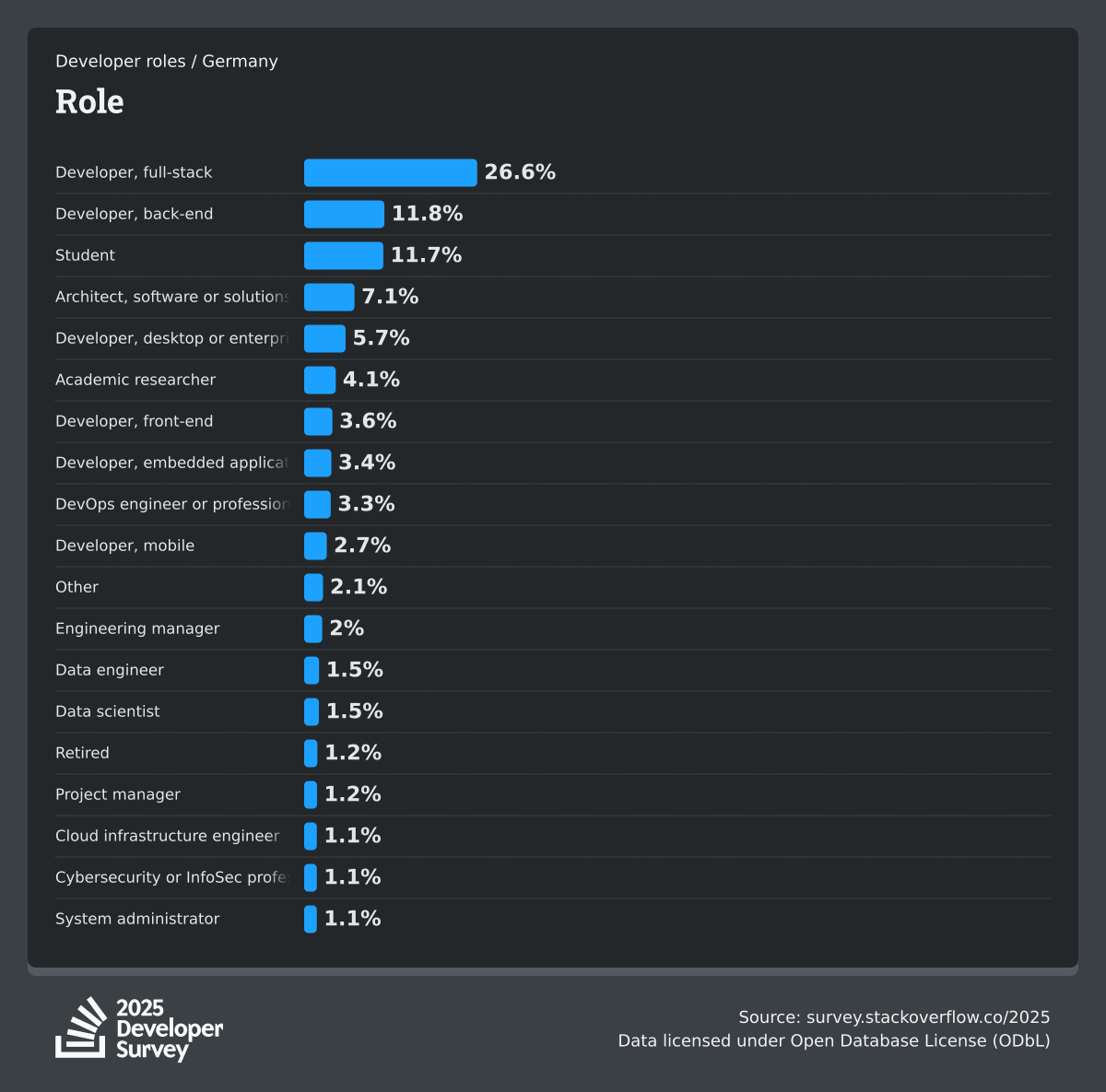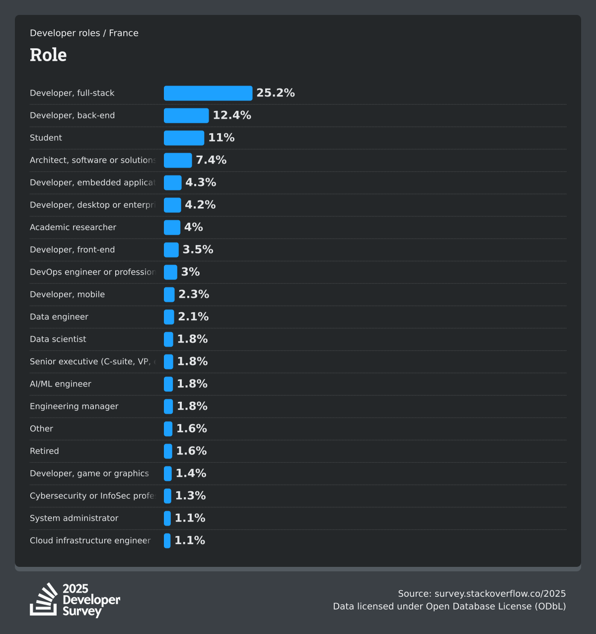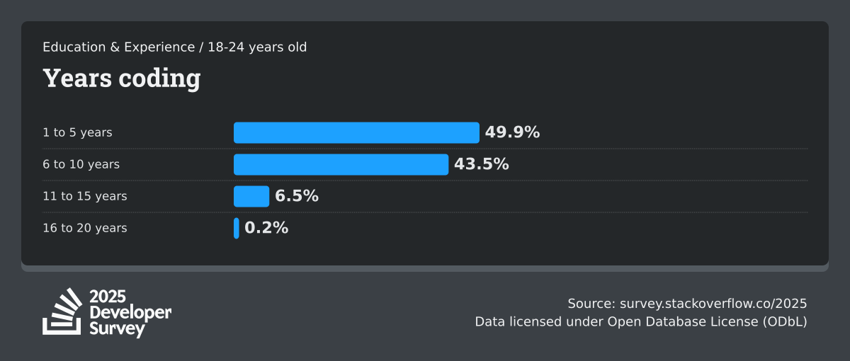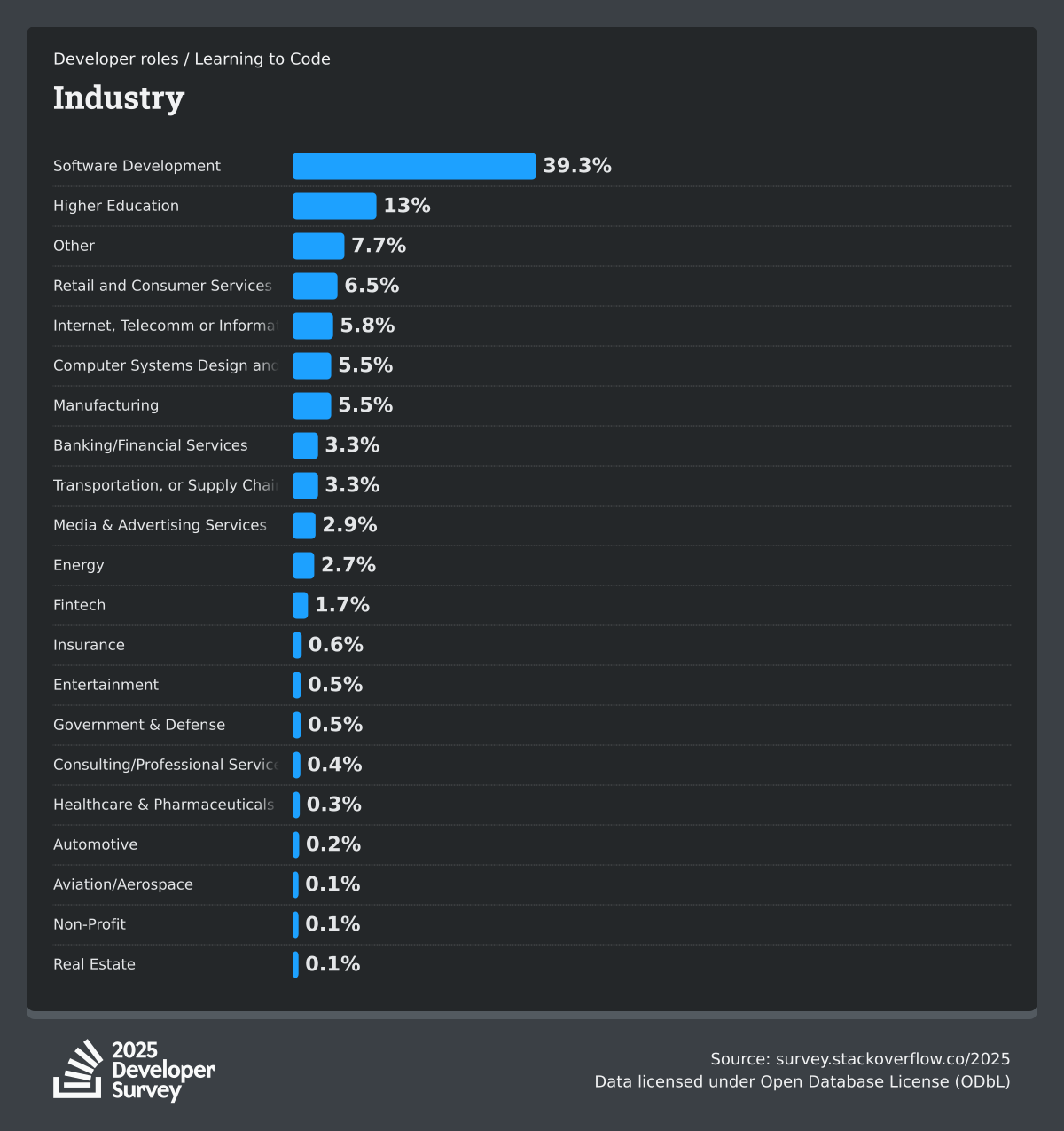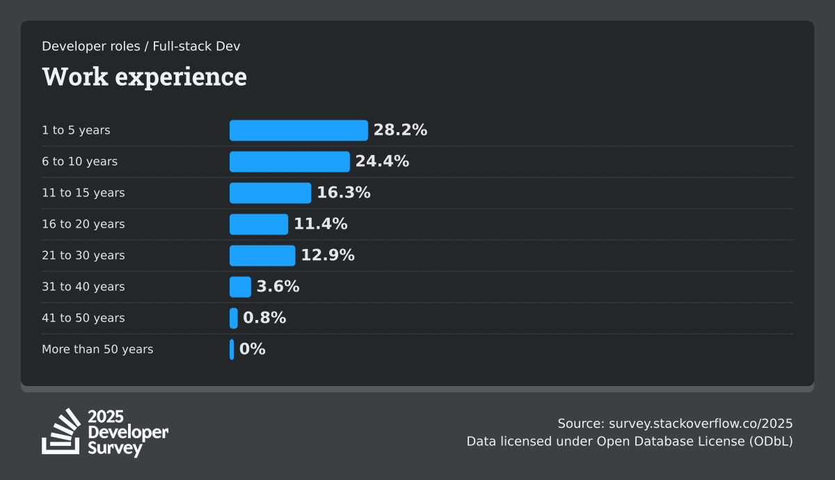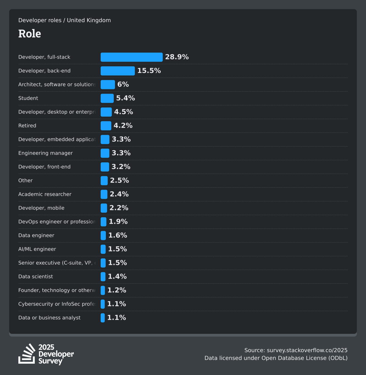 The Developer Survey is meant to explore insights for those that code. A majority of respondents (76%) are professional developers with an additional 15% that are aspirational or adjacent.